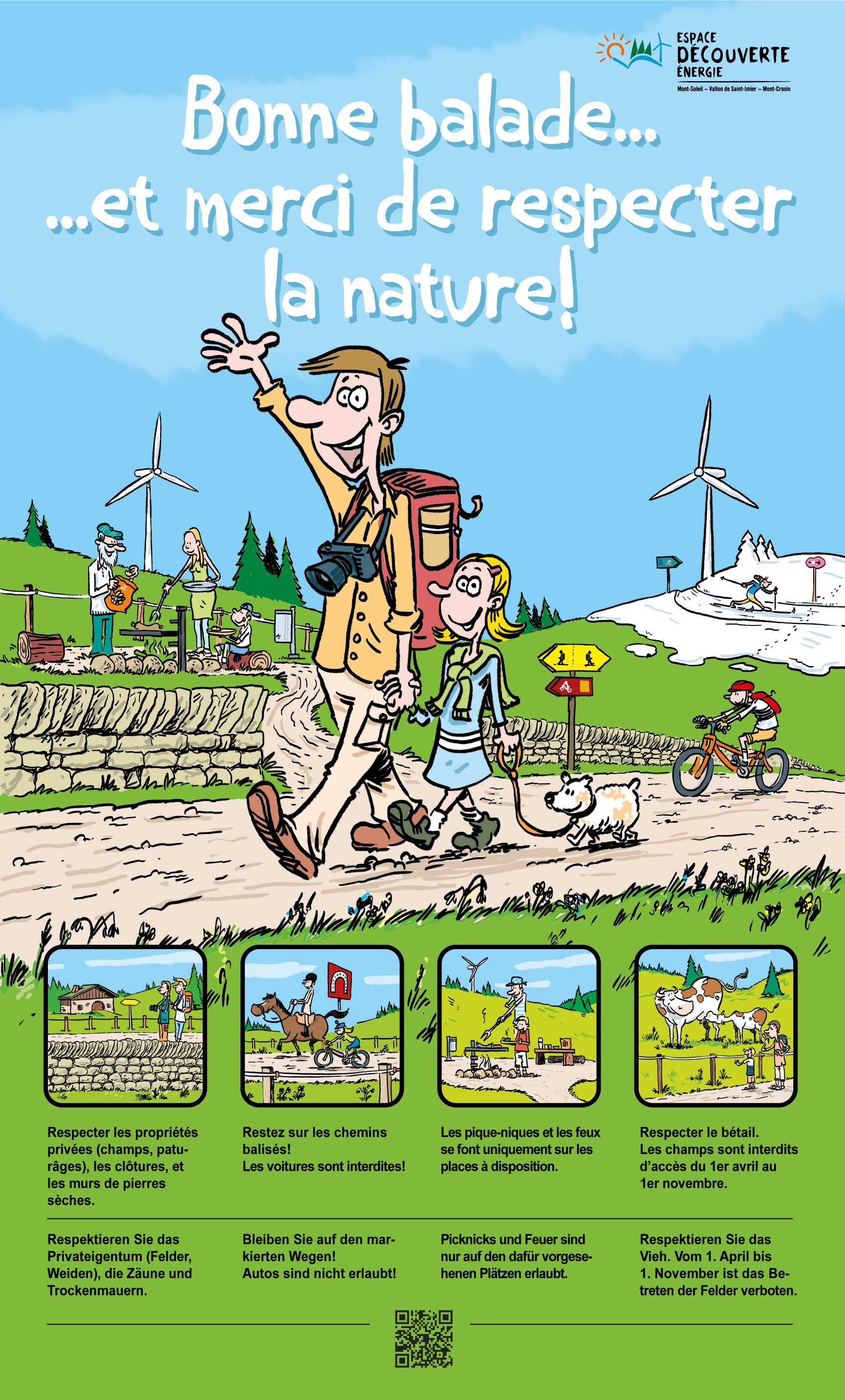 Merci également de respecter le bétail et de garder vos distances avec les animaux. Les champs sont fermés à l’accès du 1er avril au 1er novembre, période durant laquelle les cultures et les prairies sont particulièrement sensibles.